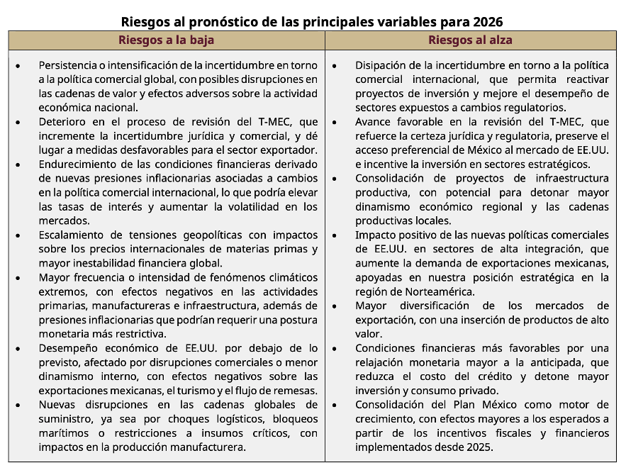 Con fecha 8 de septiembre de 2025 se presentó el paquete económico 2026, en el cual se contempla los Criterios de Política Económica, el entorno económico global está marcado por una elevada incertidumbre producto de la política comercial estadounidense y tensiones geopolíticas que han deteriorado las perspectivas de crecimiento económico y alimentado episodios de volatilidad financiera.